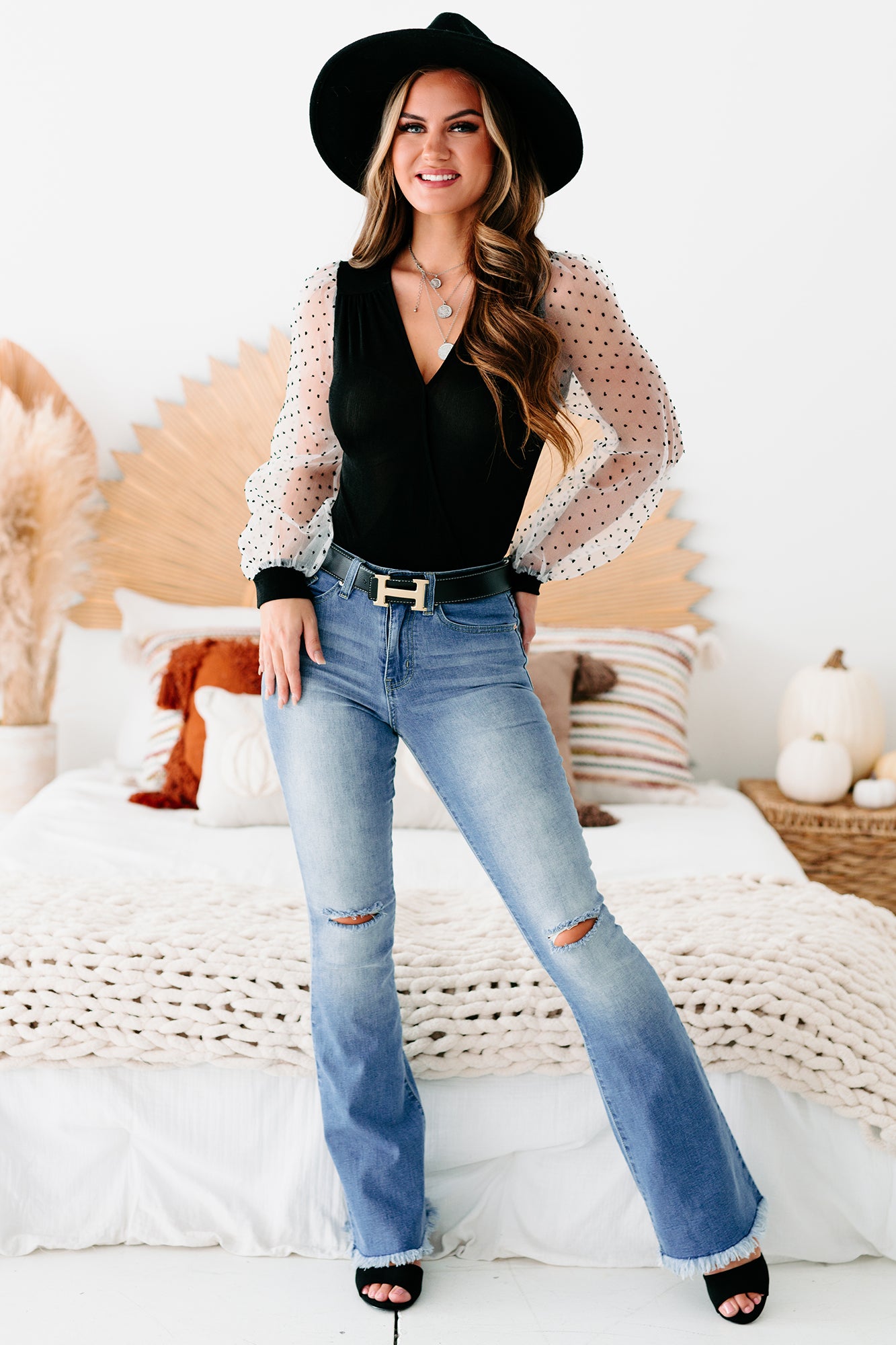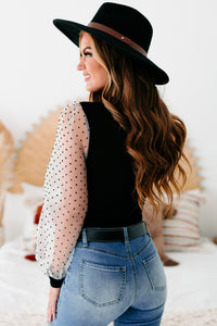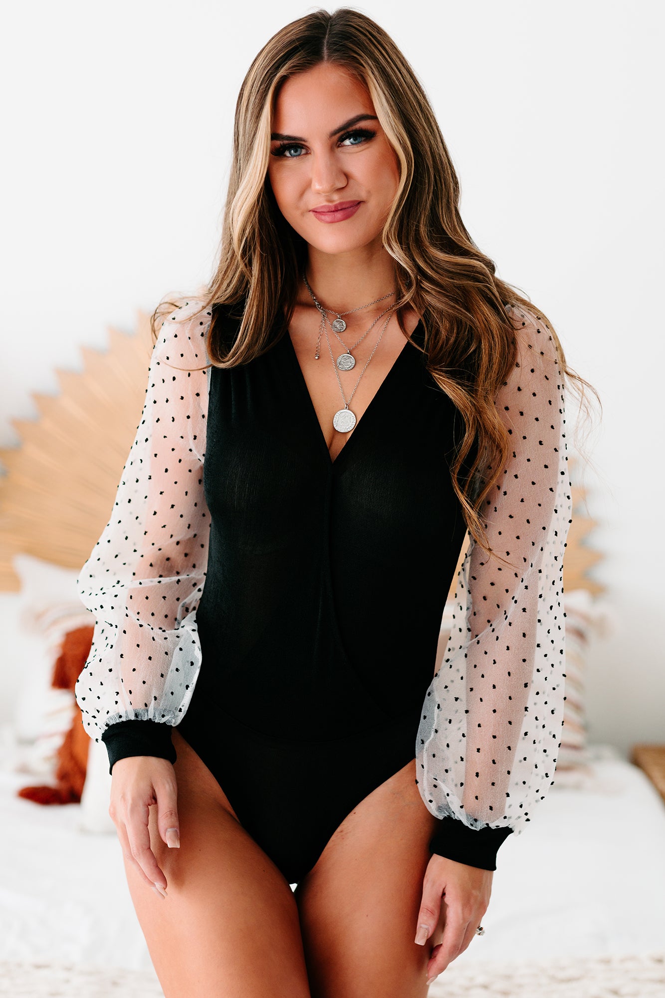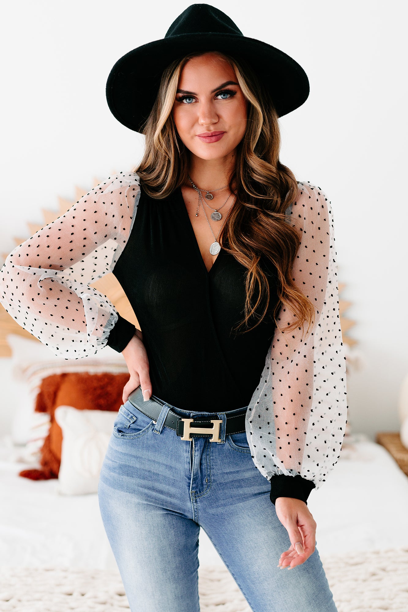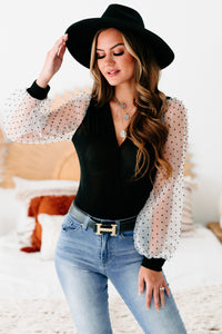 You're Sure To Get Attention With This Black, Surplice Bodysuit! The Contrasted, Organza Sleeves With The Textured Dot Detail Are Statement-Making!