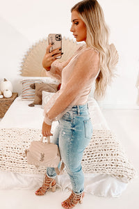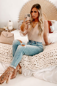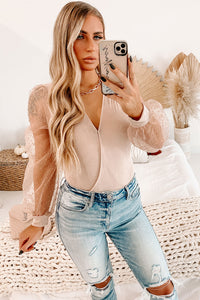You're Sure To Get Attention With This Taupe, Surplice Bodysuit! The Contrasted, Organza Sleeves With The Textured Dot Detail Are Statement-Making!