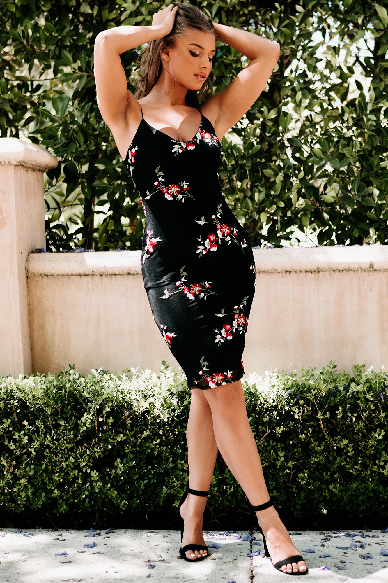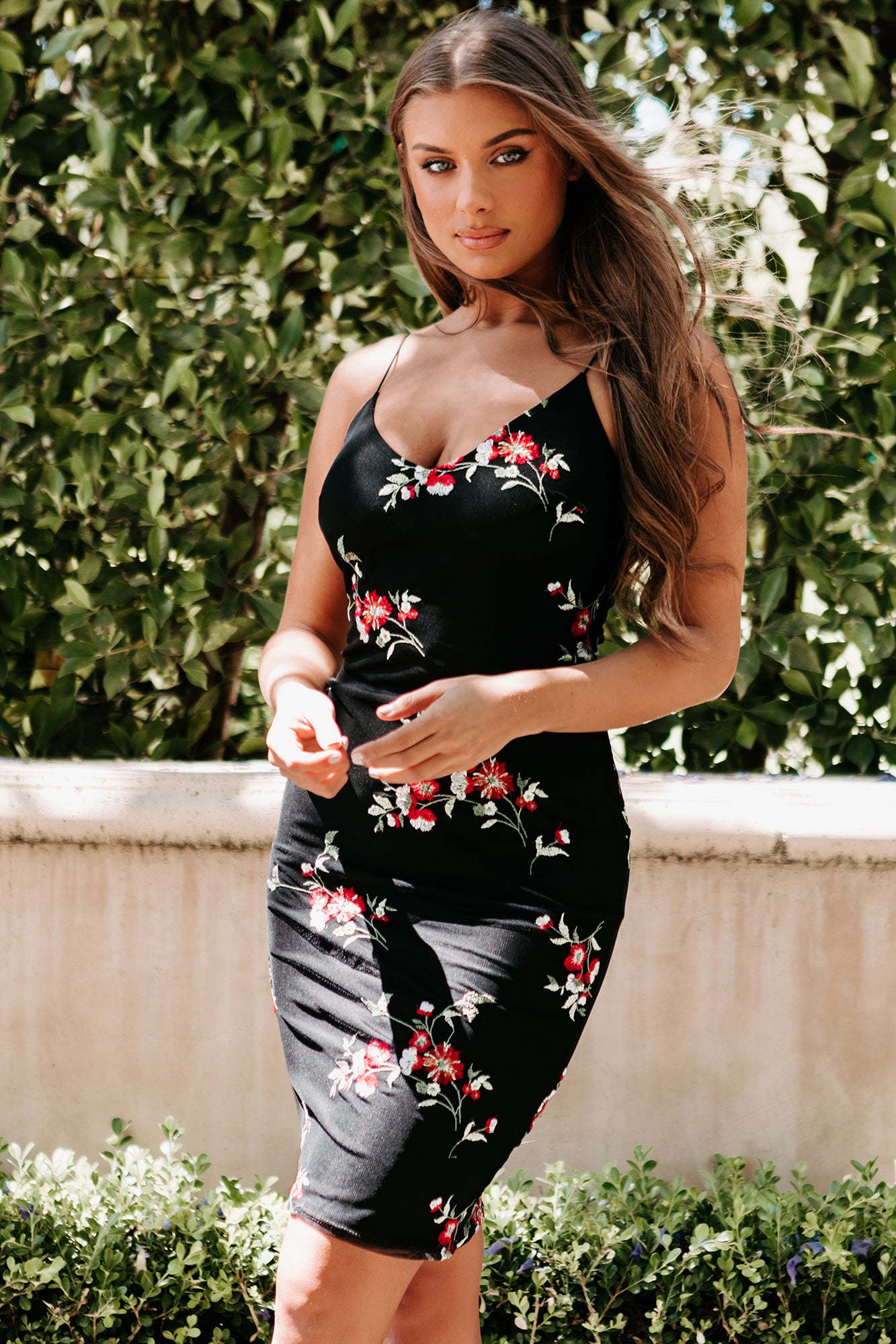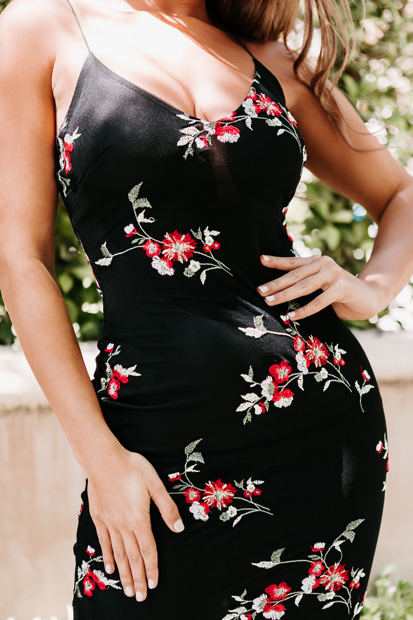 Sweeter Than Before Floral Embroidered Mesh Midi Dress (Black) - NanaMacs