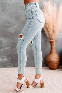 This Perfect Pair Of Light Wash, High Rise, Distressed Skinny Jeans With Raw Hem Will Pair Perfectly With Graphics, Sweaters, Bodysuits And So Much More!