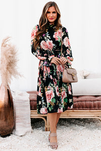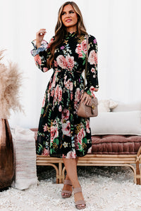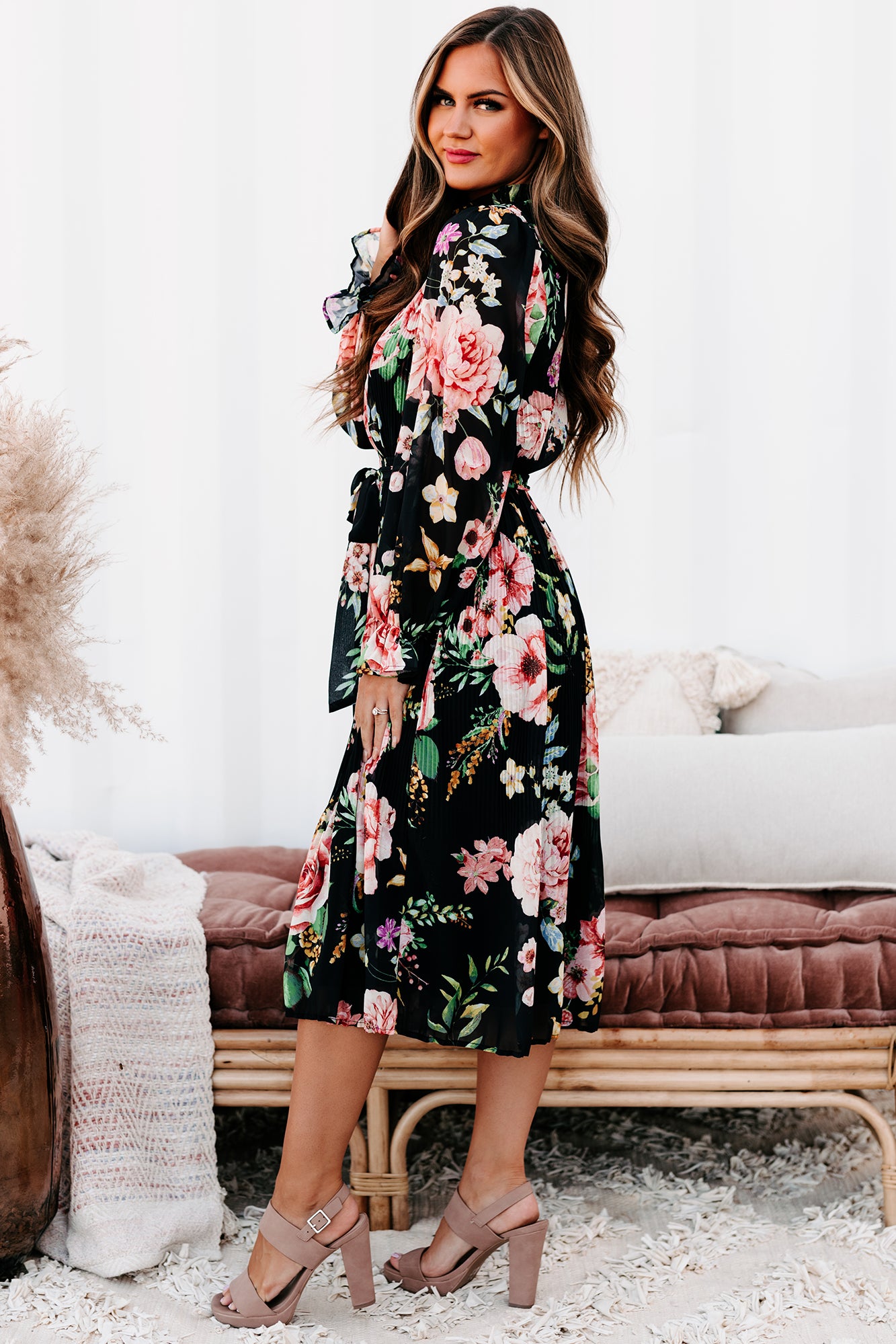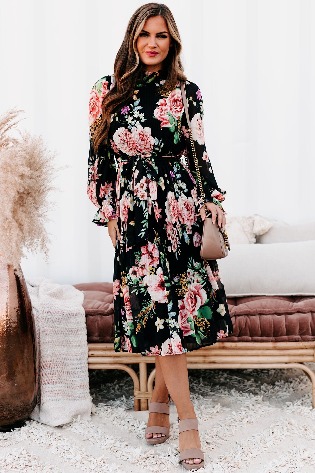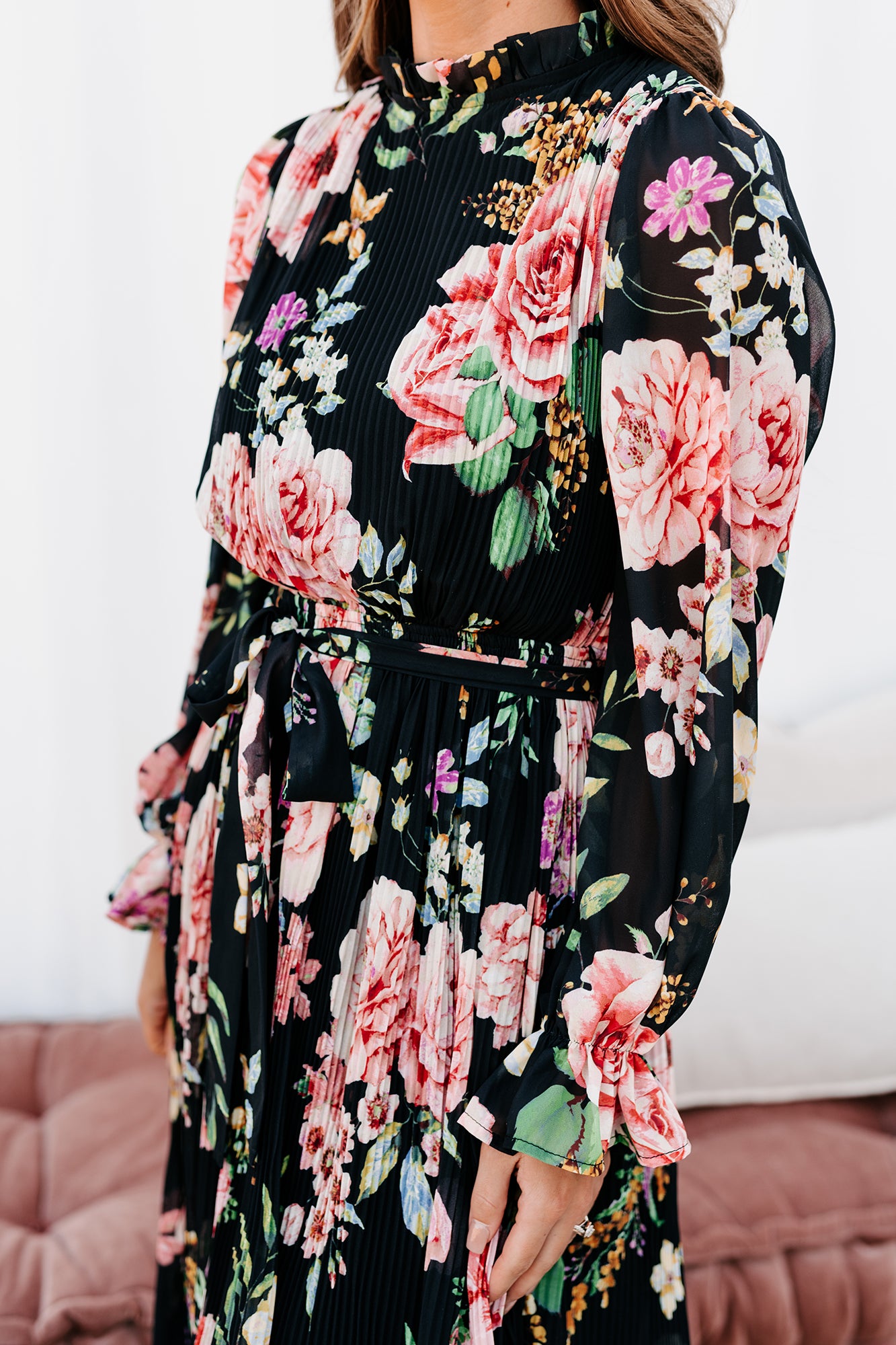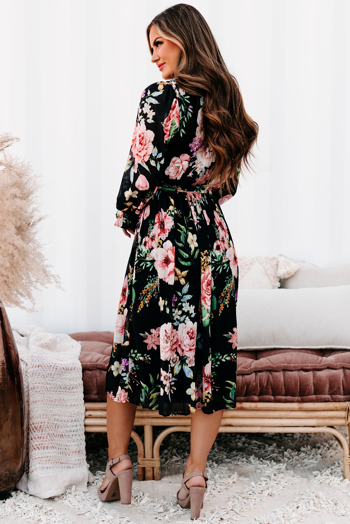 Tea & Crumpets Pleated Floral Midi Dress (Black)