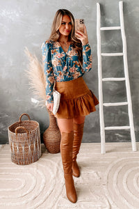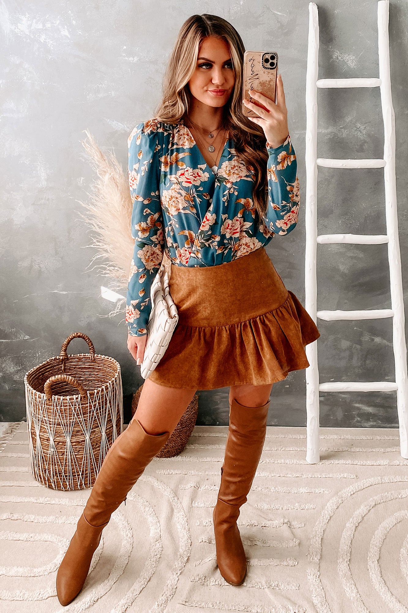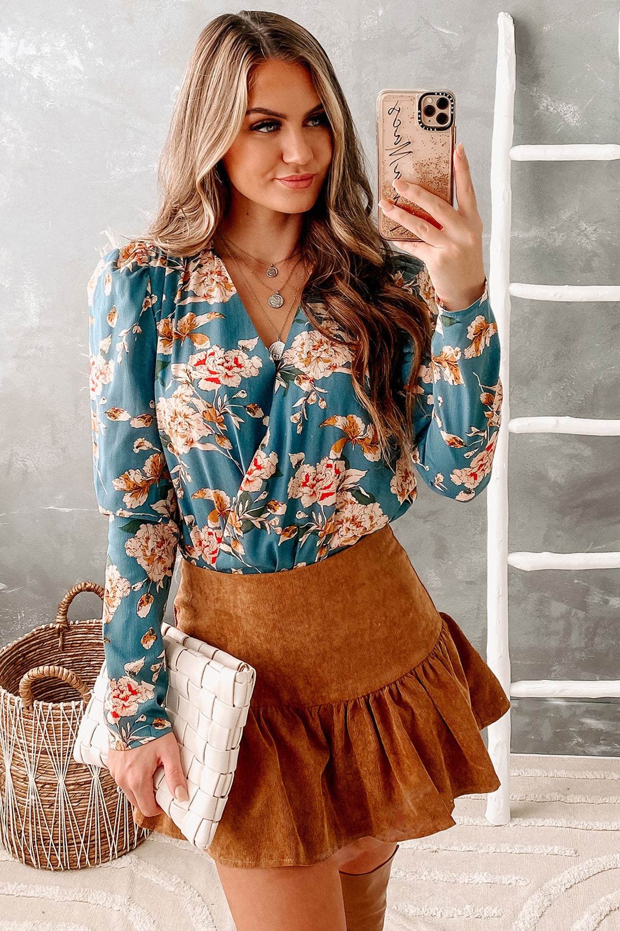 You're Gonna Look Amazing In This Teal, Floral Printed, Long Sleeved, Surplice Bodysuit!