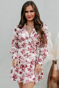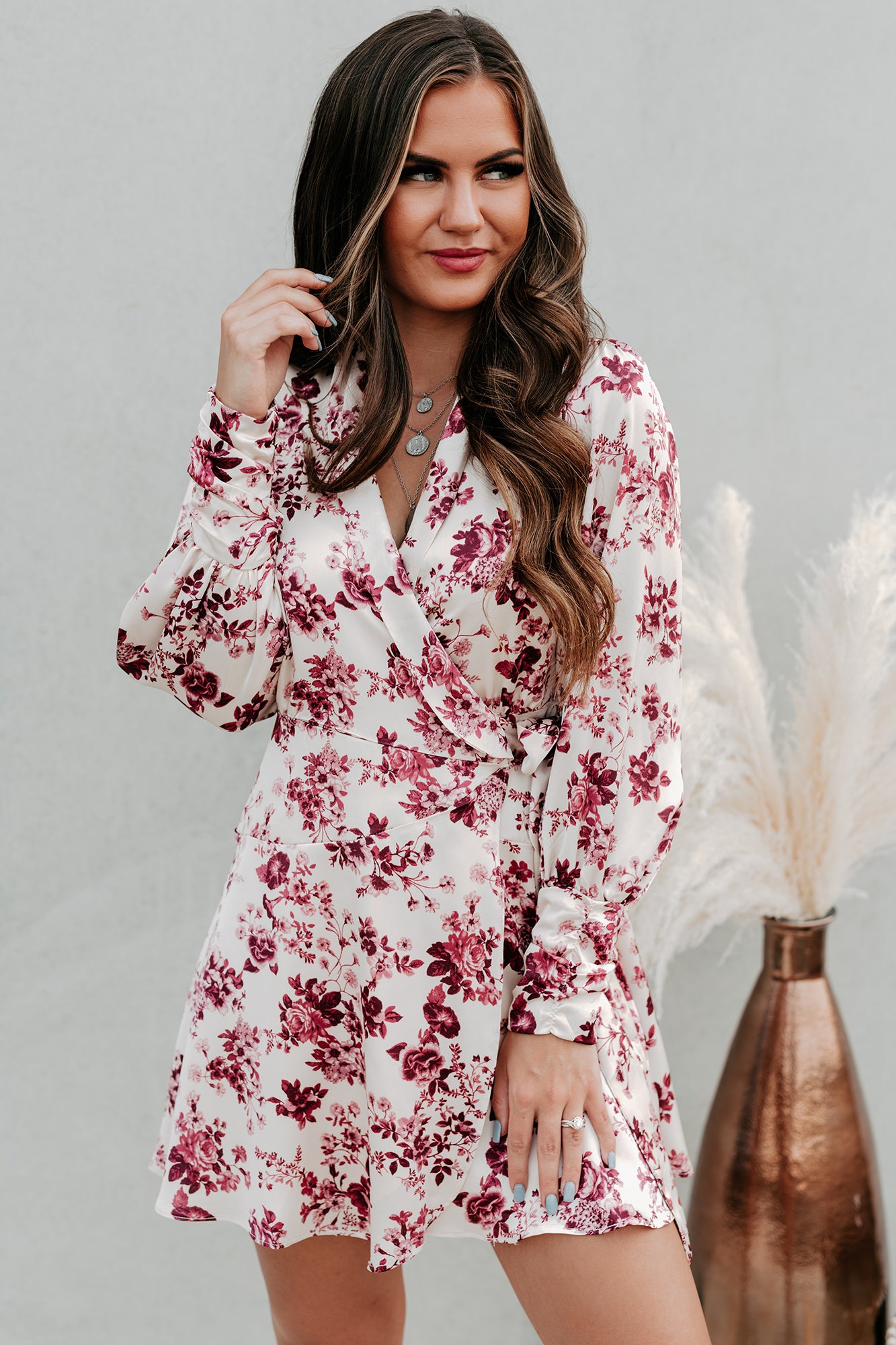 Be Picture Perfect In This Cream/Wine, Long Sleeve, Satin, Floral Wrap Dress!