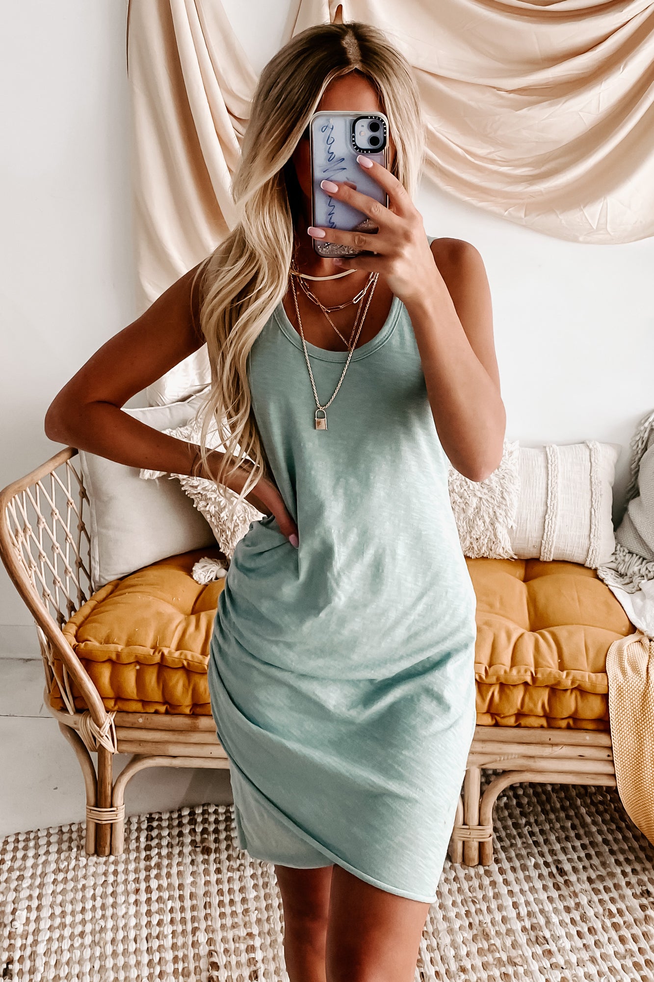 Tiffany Short Sleeve Tulip Hem Ruched Dress (Two Tone Sage) - NanaMacs