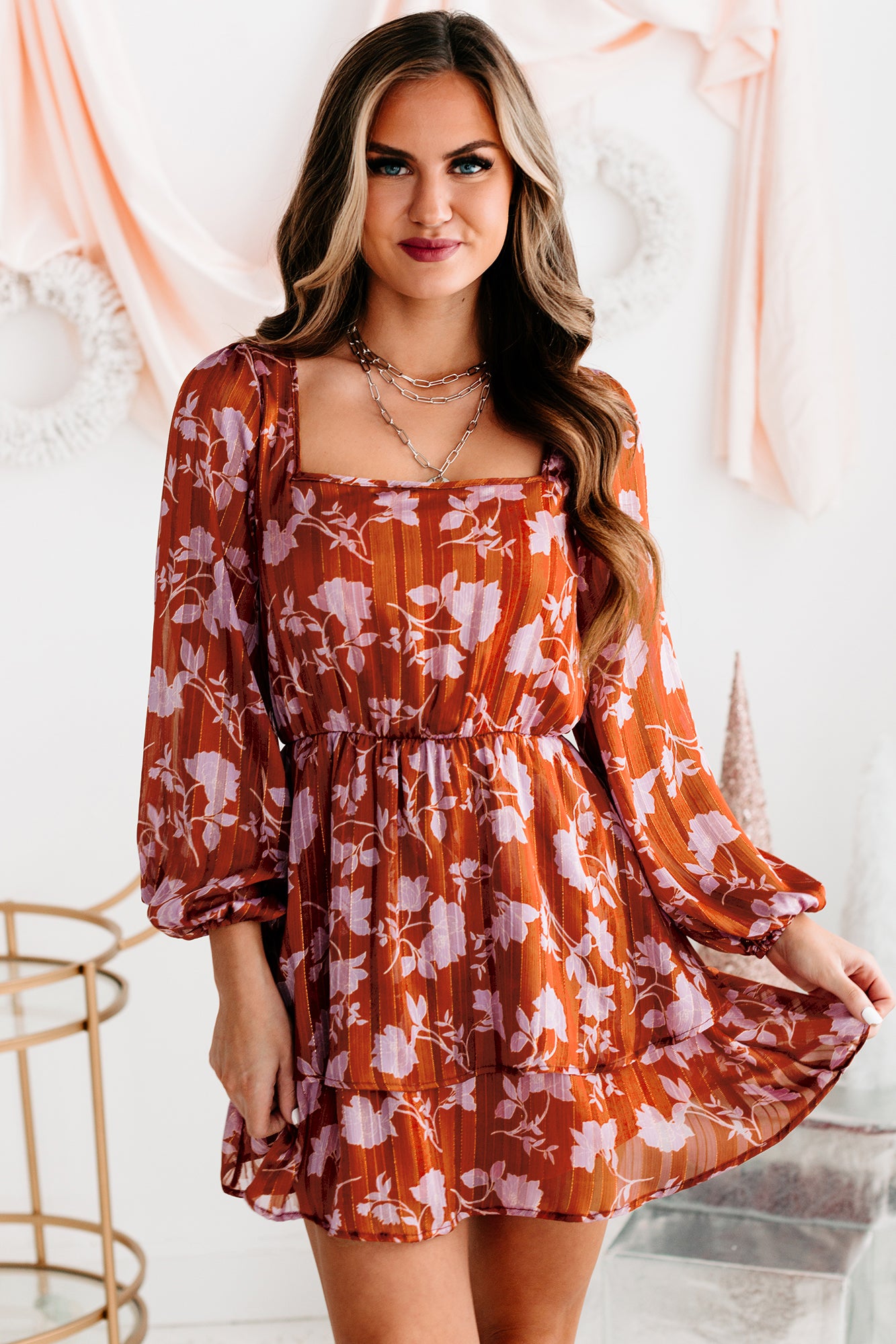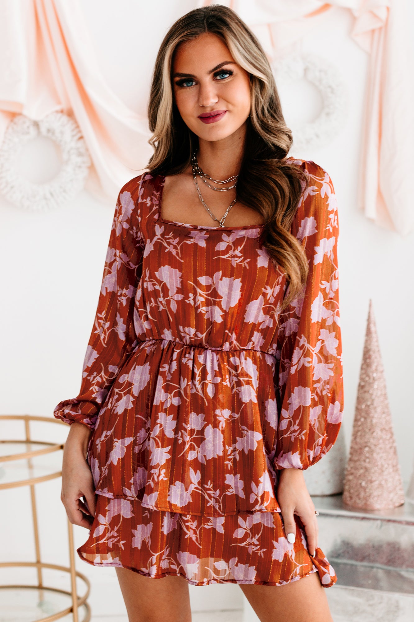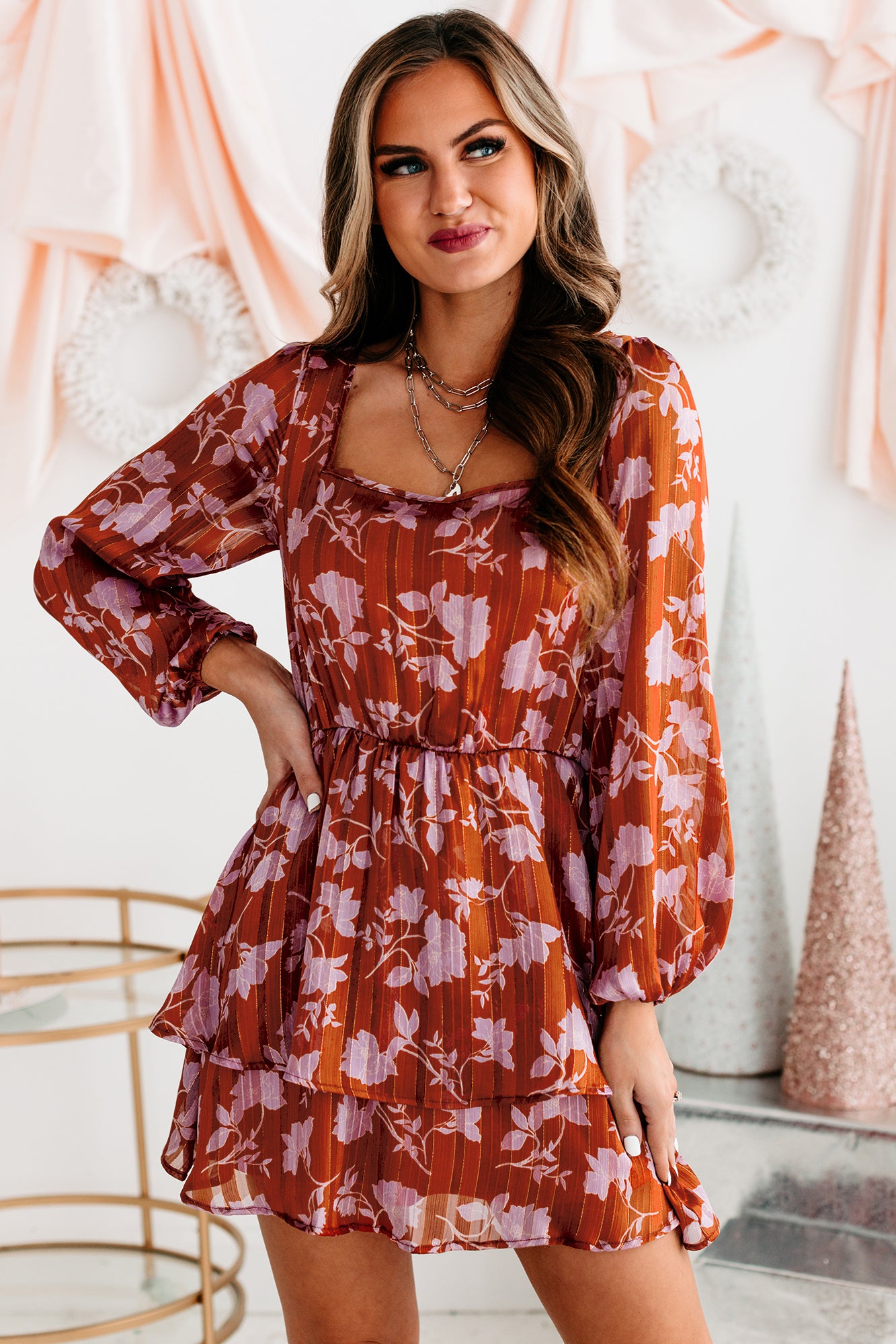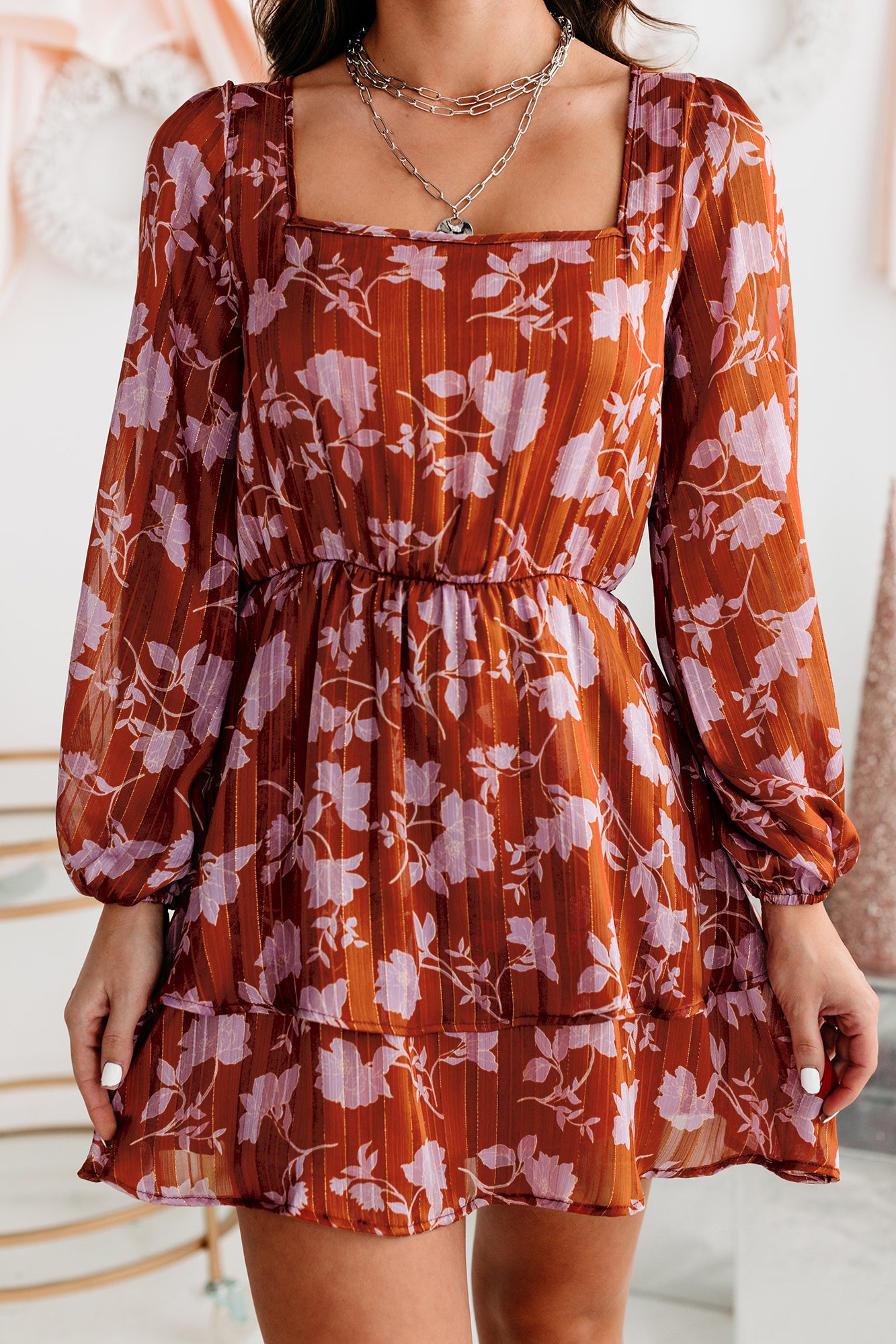 Vibrant Personality Floral/Striped Long Sleeve Mini Dress (Marsala/Lavender) - NanaMacs