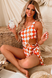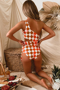 Wave Watcher One Shoulder Checkered One-Piece (Orange/Brown/White)