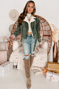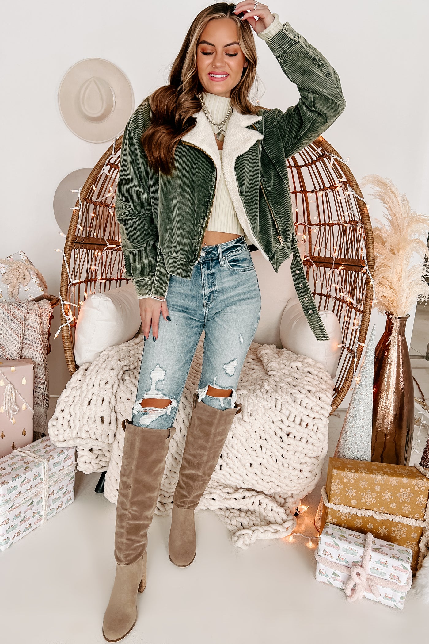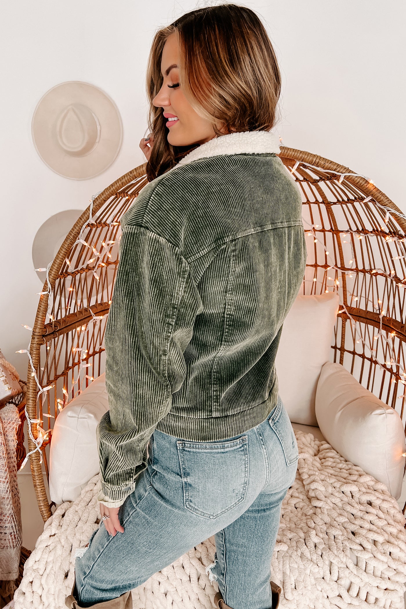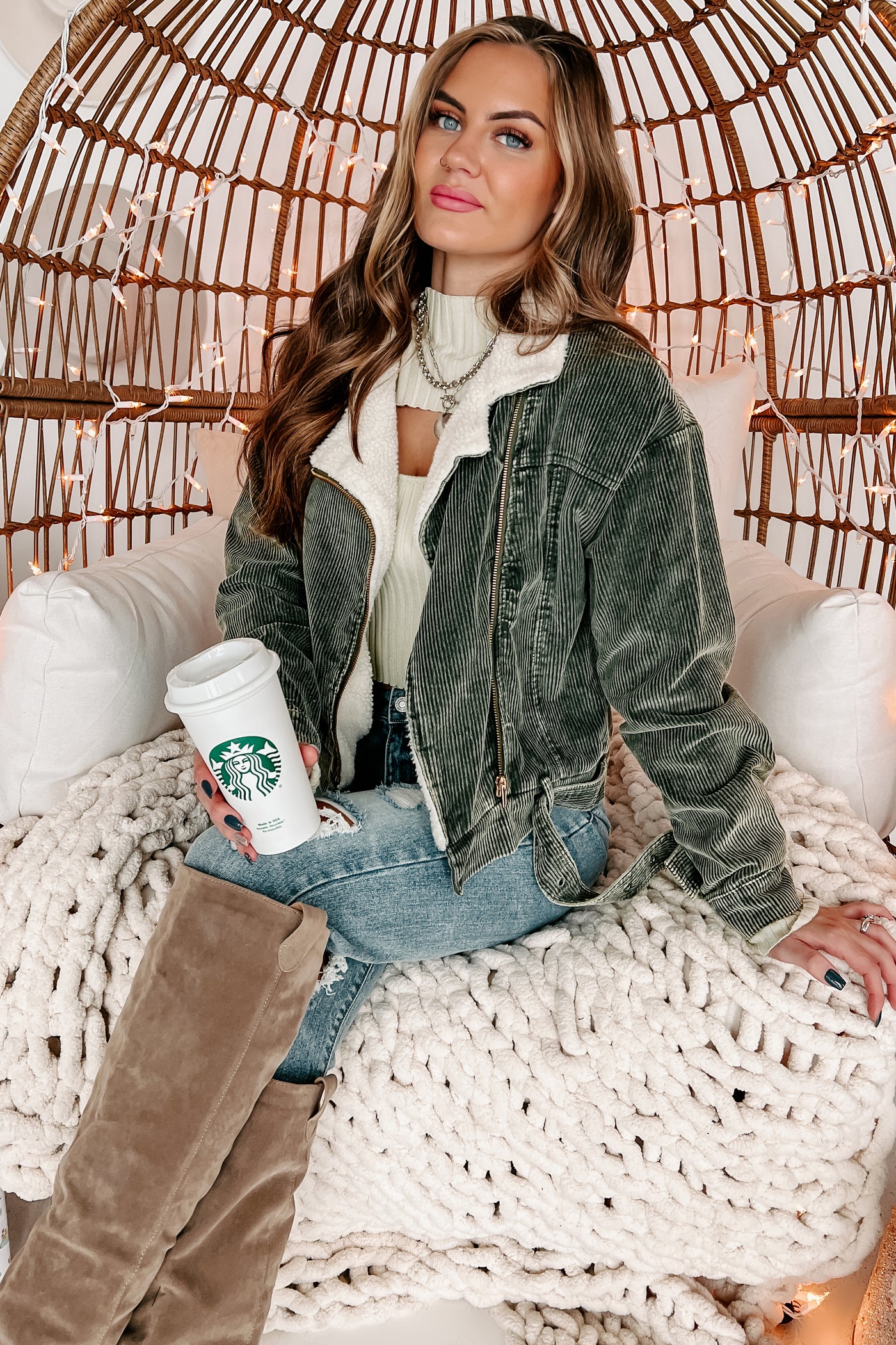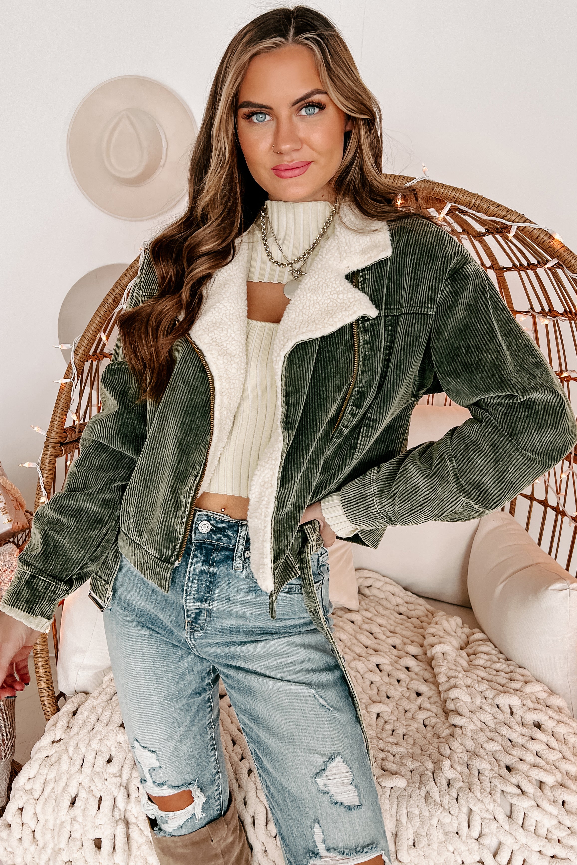 Look Cool & Edgy In This Washed Olive, Corduroy Jacket! You'll Love The Sherpa Lining & Attached Belt Detail!