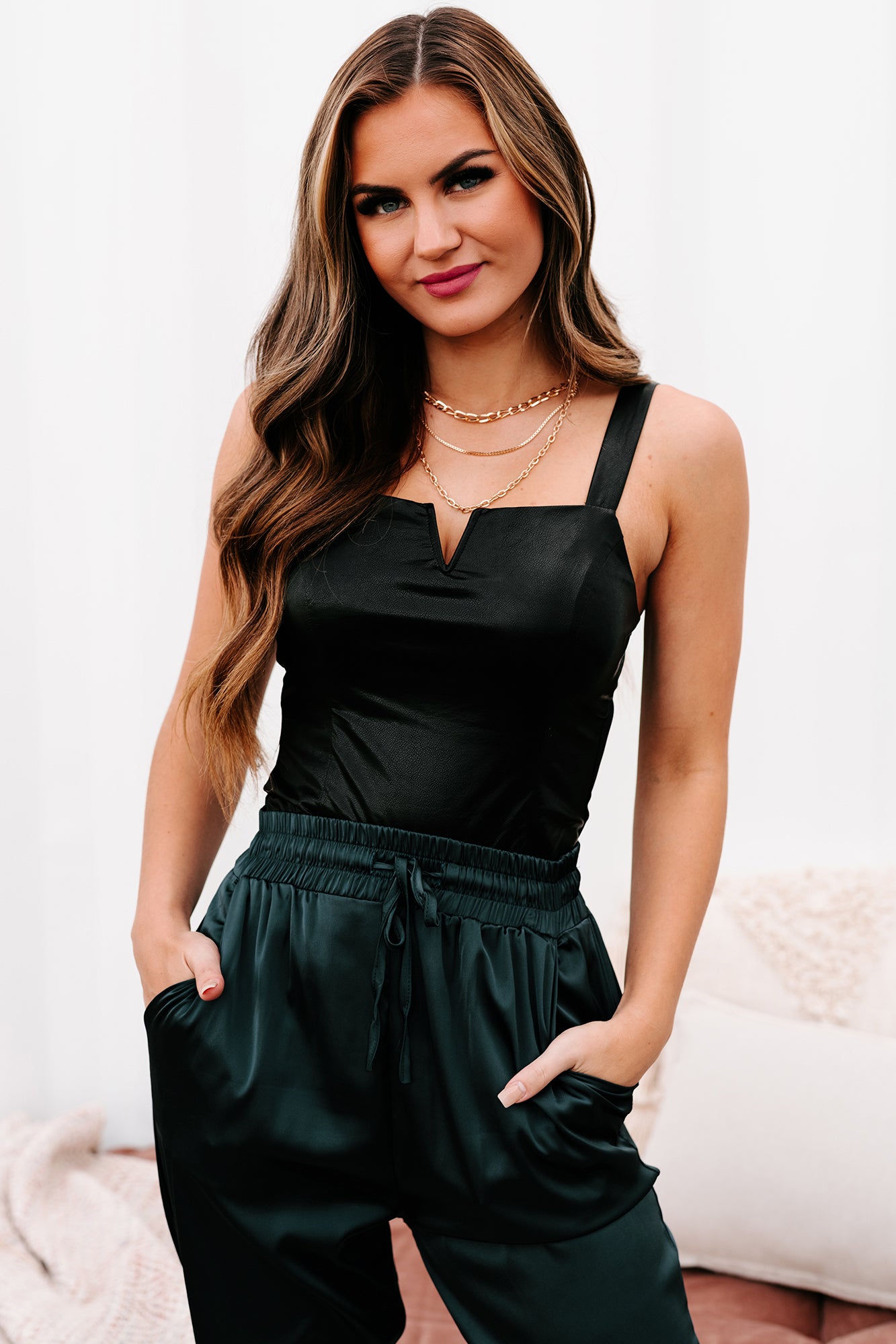 You Won't Be Able To Stop How Many Compliments You'll Recieve When You Wear This Black, V-Notched, Faux Leather Bodysuit!