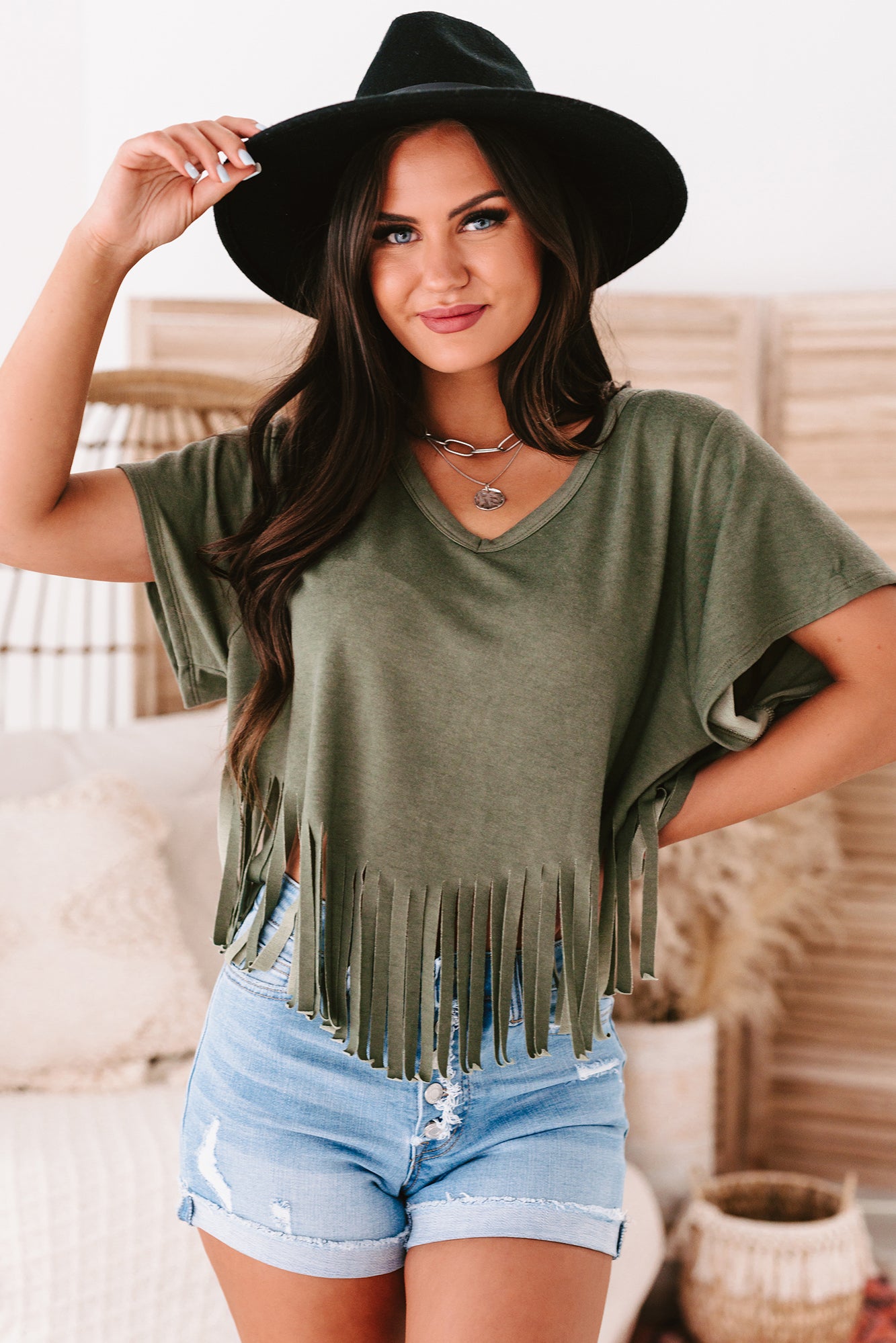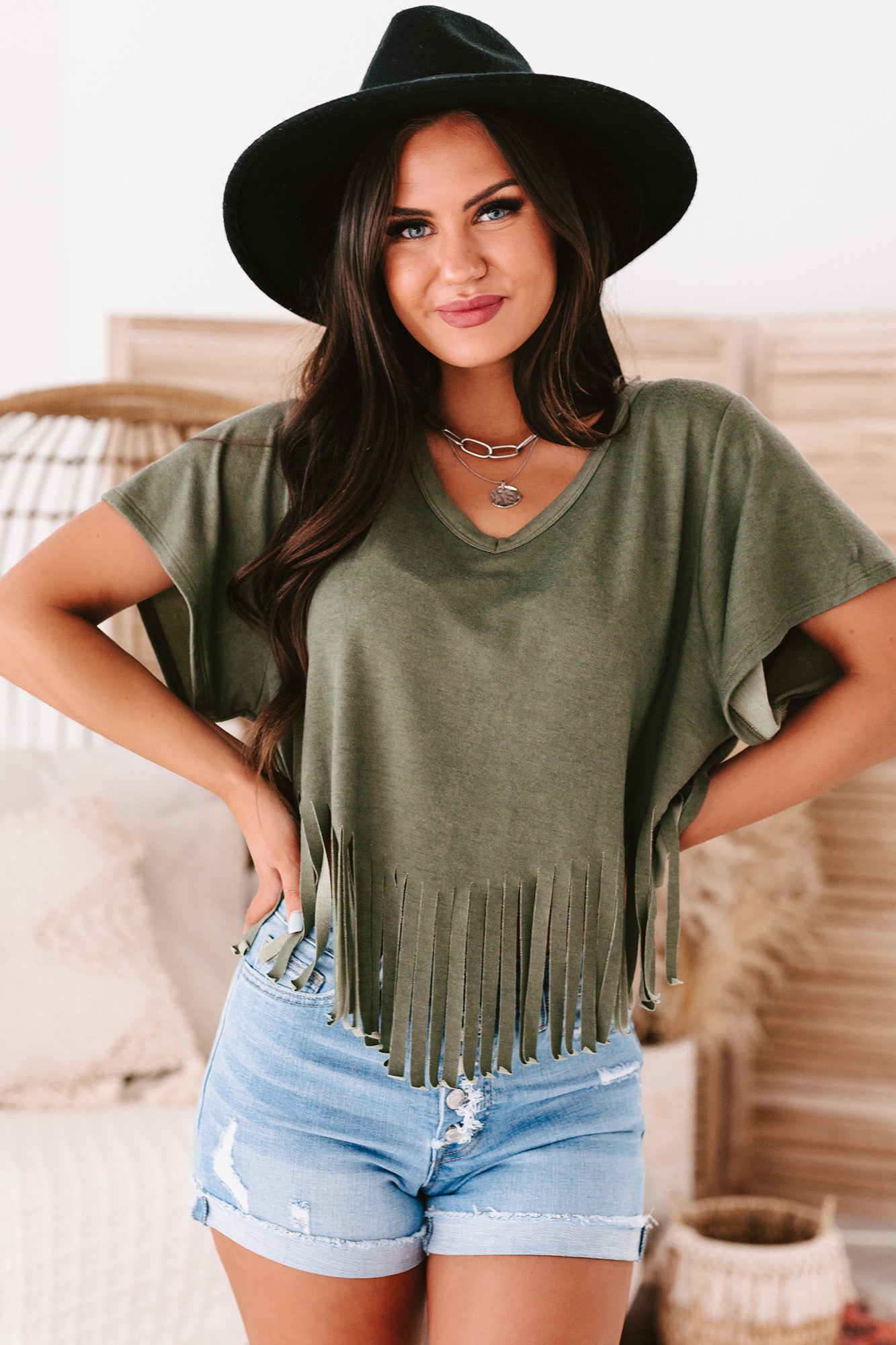 Winona V-Neck Fringed Hem Top (Olive) - NanaMacs