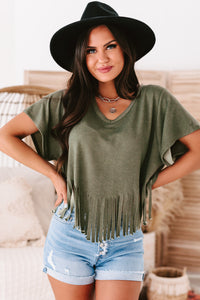 Dance The Night Away In This Olive, V-Neck, Short Sleeved, Fringe Hem Top!