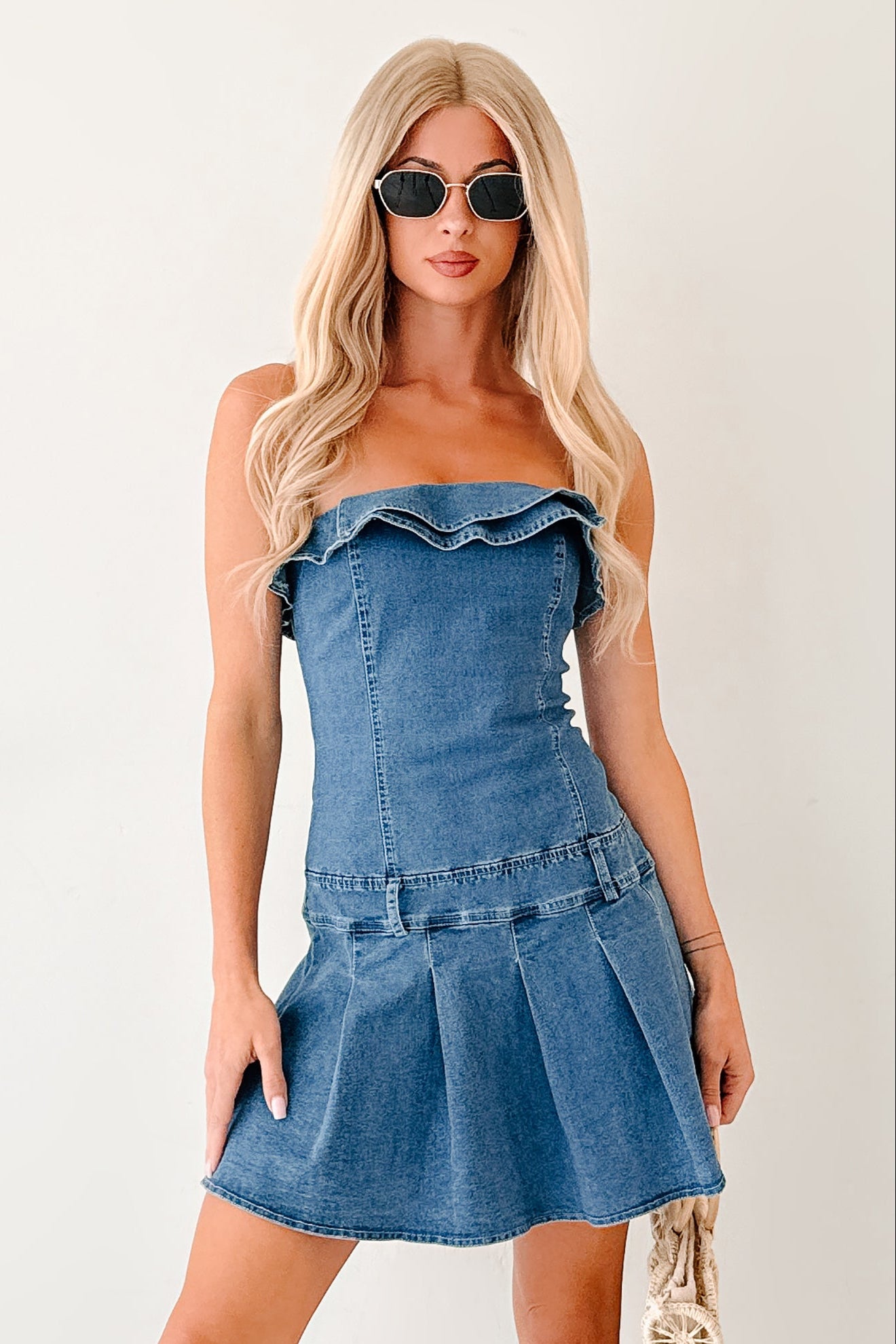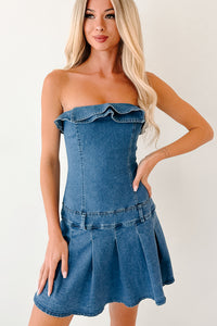 Work It Out Strapless Pleated Ruffle Mini Dress (Denim) - NanaMacs
